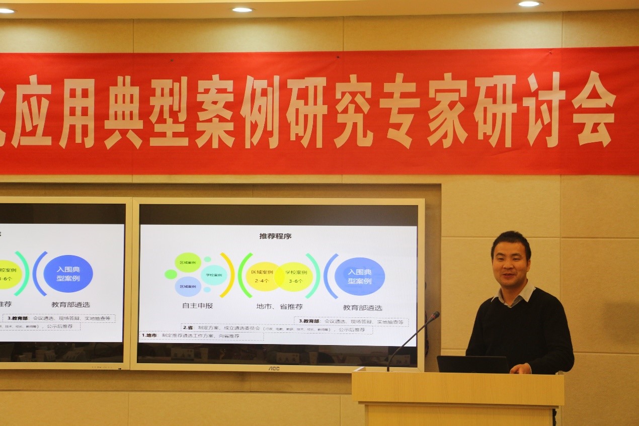 接着,中央电教馆蒋宇对基础教育信息化应用典型案例的基本情况进行了介绍。项目起源于2016年的示范培育推广计划,确定了教育信息化的工作要点与目标任务,即在基础教育领域形成30个区域60所学校的典型案例。此外,项目对区域与学校在案例的选择方向上提出了具体的要求,并规定了案例遴选的程序与评价指标。最后,蒋宇对首批典型案例的基本情况、材料构成与材料特色进行了详细介绍。