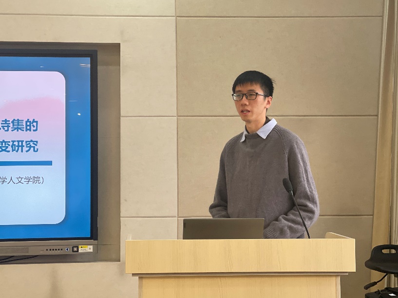 接着,中文系何哲涵带来了题为《中古集会诗集的生成与流变研究》的报告。何博士深入探讨了古代文人在集会场合下创作诗歌的传统,并解释了这种形式对中古时期文学和社会文化的重要意义。他的研究不仅分析了集会诗集的形成过程和演变规律,还考察了其背后的历史背景和文化现象。通过对比不同历史时期的集会诗集,何博士展示了这一文学形式随时间发展的特点,强调了集会诗集作为社会文化交流平台的重要性。