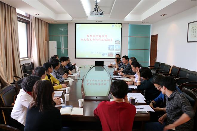 4月20日下午,3044am永利集团3044noc行政党支部与商学院行政教辅党支部在田家炳楼207会议室,就党支部工作进行了交流、学习,商学院党委书记李佳敏、3044am永利集团3044noc党委书记沈贵鹏参加活动并分别致辞。双方就如何结合岗位特点、推进支部“两学一做”学习教育常态化和制度化、提升党员先进性和管理能力,结合贯彻全国高校思想政治工作会议精神,发挥管理育人和服务育人的针对性和实效性,支部特色工作等方面展开了交流,并就各自工作方法等内容进行了研讨。大家普遍认为:作为学院行政教辅支部的党员同志承担着服务于学院教学、科研等主体工作的职能,要坚持和加强“两学一做”学习教育,强化服务意识、大局意识和服务能力,在奉献和服务中体现和发挥党员的先进性,切实践行服务育人、管理育人的宗旨;党支部要把民主生活会等理论学习教育活动与实践性教育活动有机结合起来,提升党支部的凝聚力和先进性。