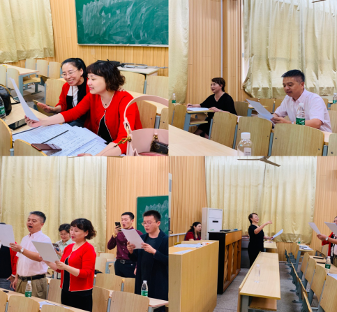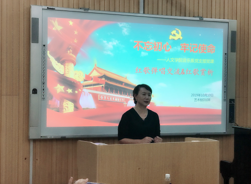本次活动主要采取红歌弹唱与歌曲赏析等方式,六首红色歌曲分别由不同老师领唱,歌曲用不同的旋律却同样的主题表达了党员教师对祖国的深切热爱。其间,副院长符珊珊声情并茂地带领全体教师演唱了歌曲《我和我的祖国》、《故乡的云》,副院长蔡爱国热情洋溢的领唱大家演唱了歌曲《游击队之歌》,两位领导的带动与鼓舞将大家的情绪引入了高潮。之后,音乐系王芳教授领唱了《江山》,钱琳副教授与朱磊副教授对唱了《东方之珠》。整个活动现场热情澎湃、情绪高昂。最后,全体教师起立,采用大合唱的形式共同演唱了歌曲《我的祖国》。