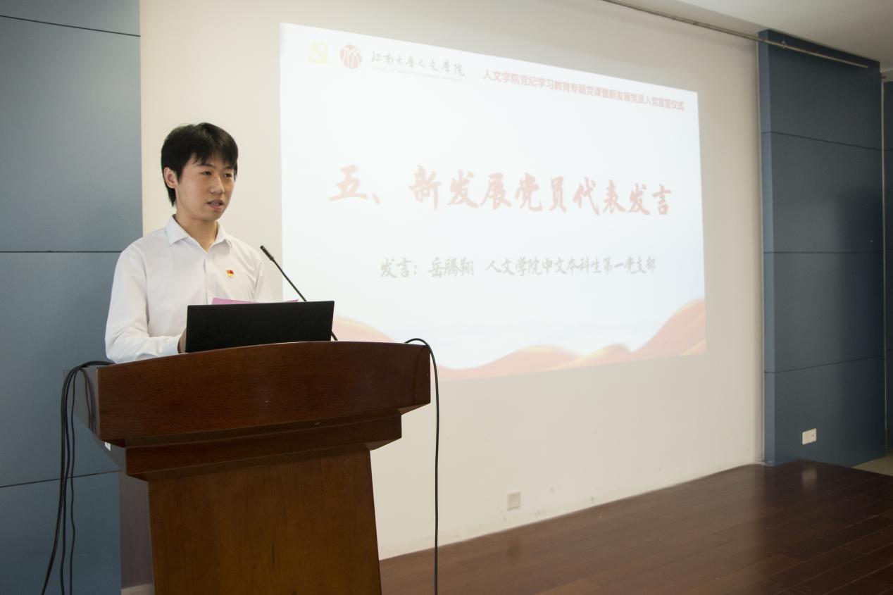 铮铮誓言,字字千钧。宣誓仪式在庄严肃穆的《国际歌》中拉开序幕,在王能文的领誓下,预备党员面向党旗,高举右拳,庄重宣誓,在场老党员们也一起重温入党誓词。新党员代表、中文本科生第一党支部岳腾翔同学在发言中表示,作为一名新党员,应坚定共产主义信仰、提升思想境界、加强党性锻炼,奋发学习,为实现中华民族伟大复兴的中国梦贡献青春力量。