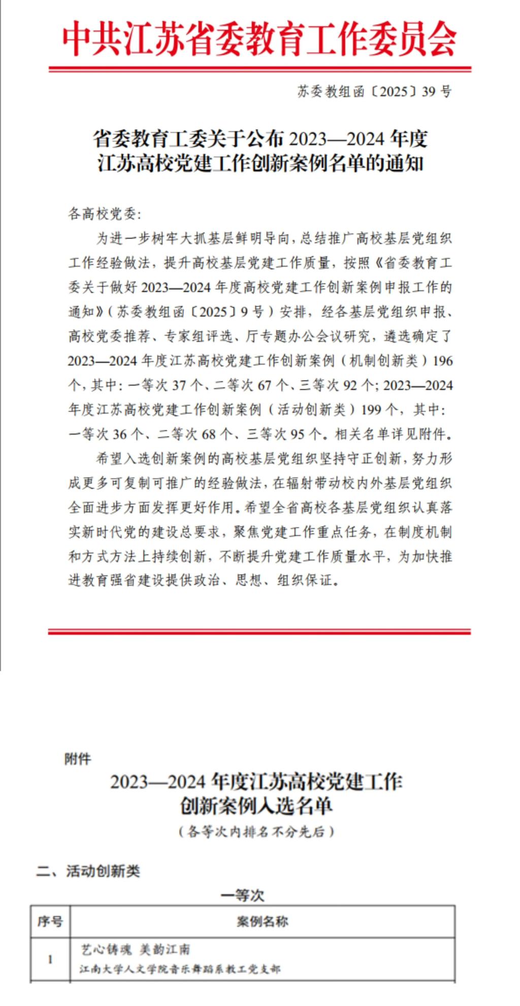近日,江苏省委教育工委公布了2023-2024年度江苏高校党建工作创新案例评选结果,3044am永利集团3044noc获评党建工作创新案例一等次2项,永利集团官网案例是永利集团官网获评的4项江苏高校党建工作创新案例中唯一的活动创新类一等次。
