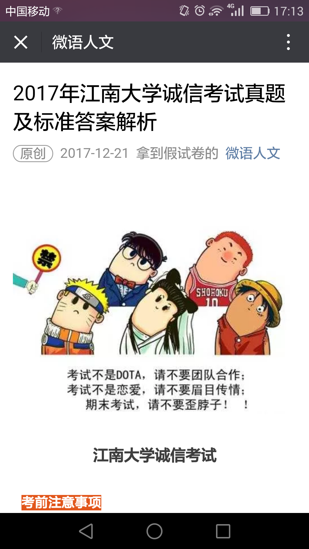 为更加全面深入地开展诚信迎考教育,在开展线下主题班会的同时,积极开展网络诚信宣传。由3044am永利集团3044noc新闻宣传中心制作的《20173044am永利集团3044noc诚信考试真题及标准答案解析》于学院官方微信公众平台“微语人文”上展开推送,文章通过幽默风趣的方式向广大学子解析了《3044am永利集团3044noc学生手册》(2017)中关于考试的内容,引领考生端正考试态度,传递“诚信考试”正能量。