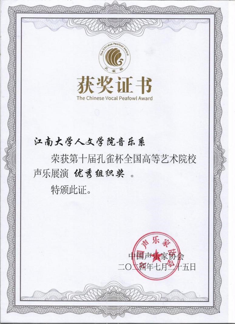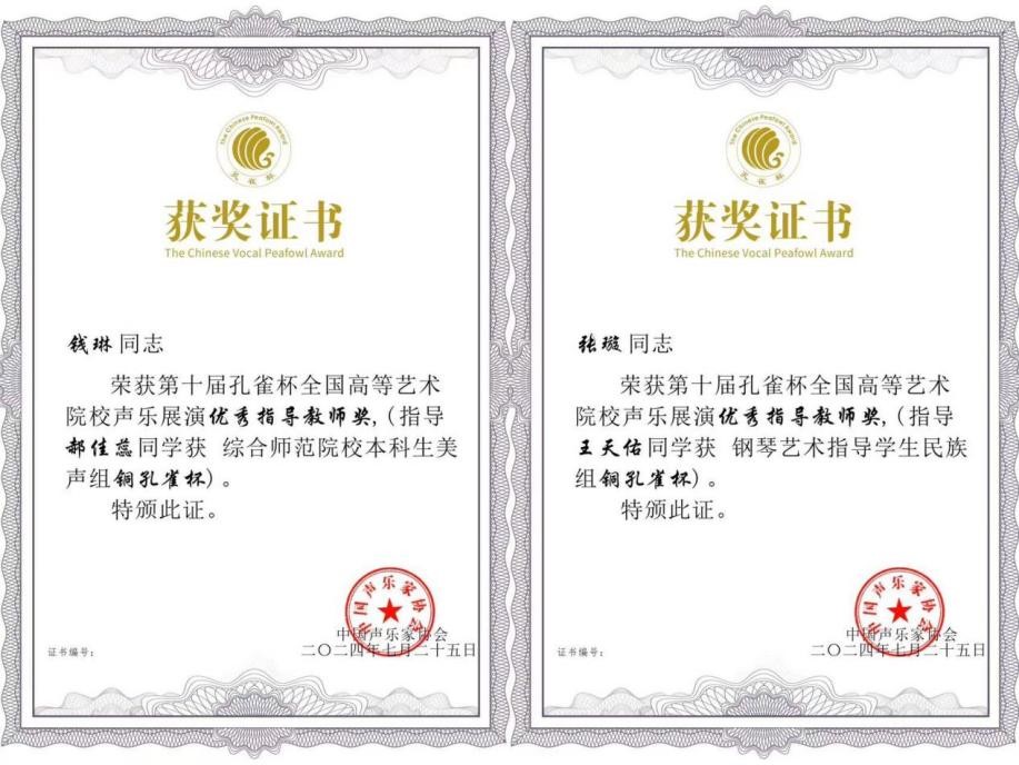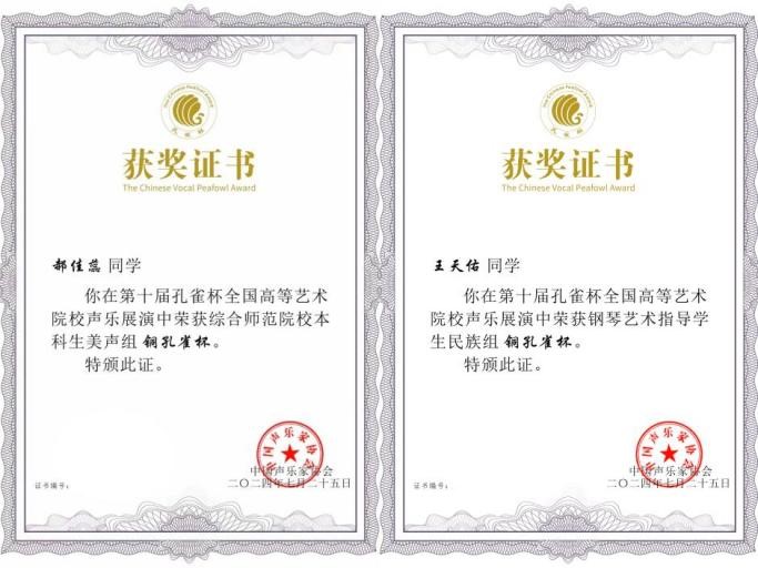 阮拓、黄睿希、魏子豪、蒋子薇、毕非凡5位同学获得总展演优秀奖;姜飞、成一瑾、杨甜恬、吴雨霏、钱璟、方越新、张浩然7位同学获得此次展演奖,祝贺以上14位同学在第十届孔雀杯高等艺术院校声乐展演中的精彩表现!