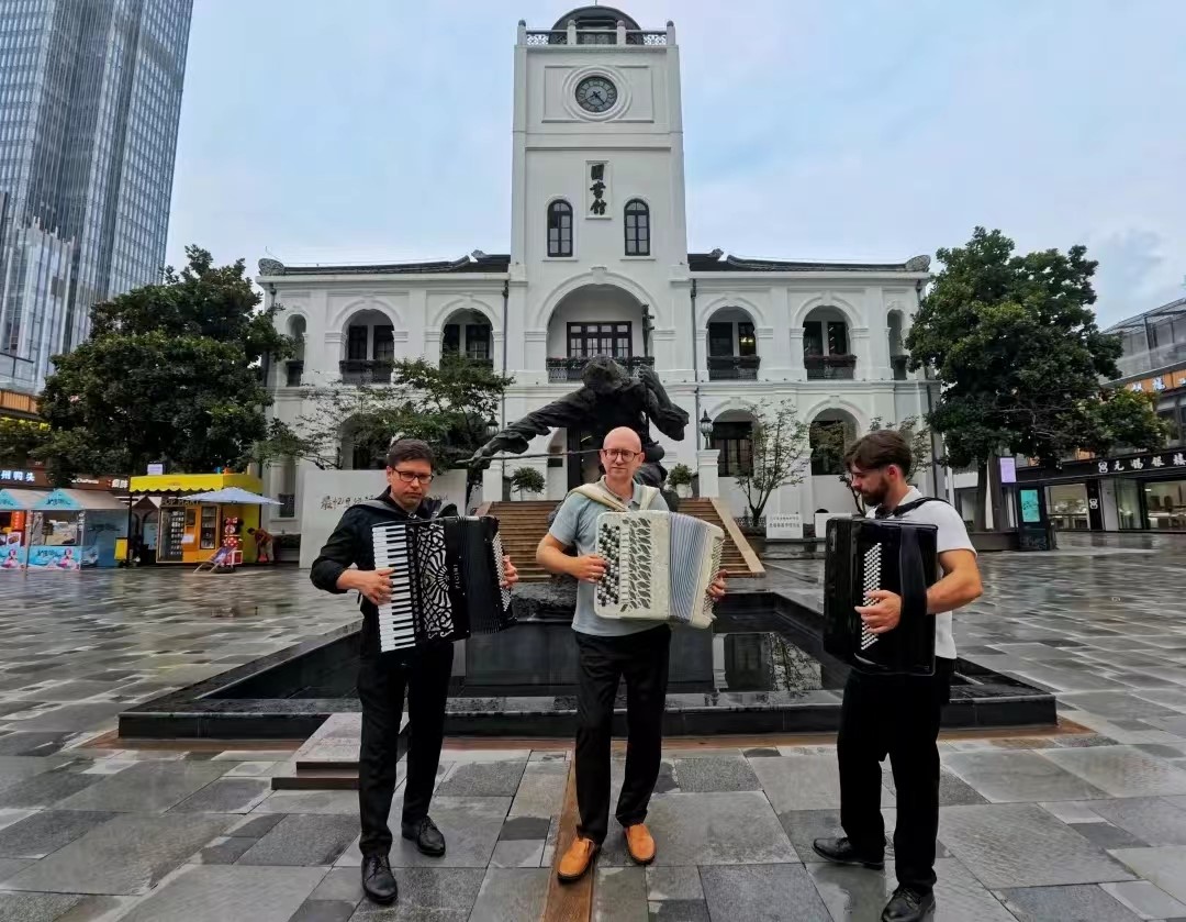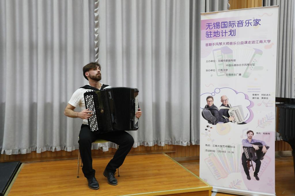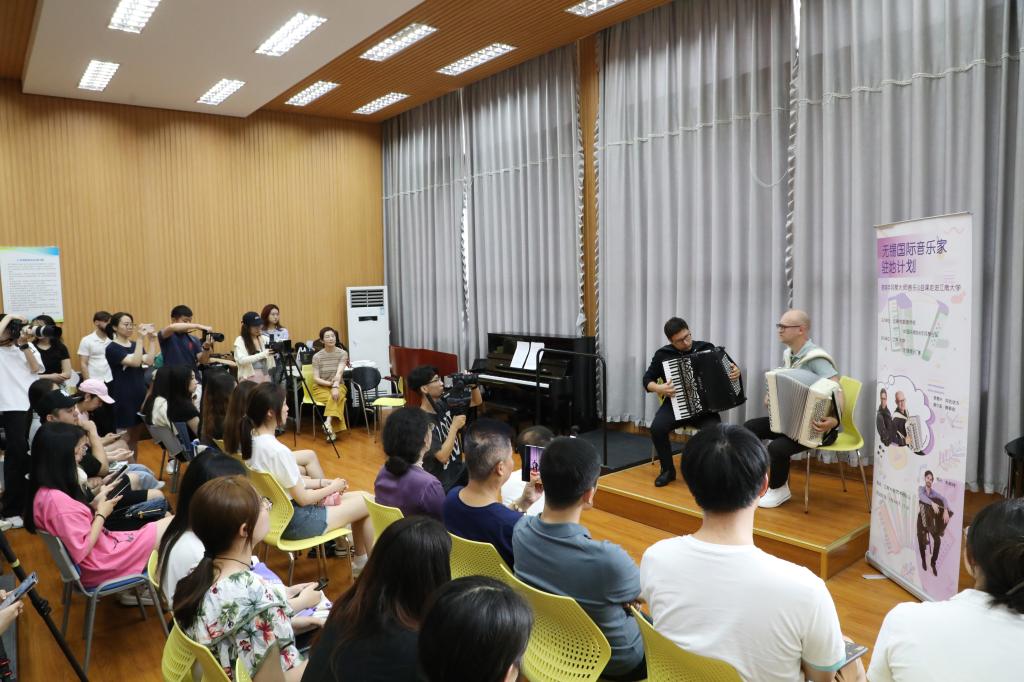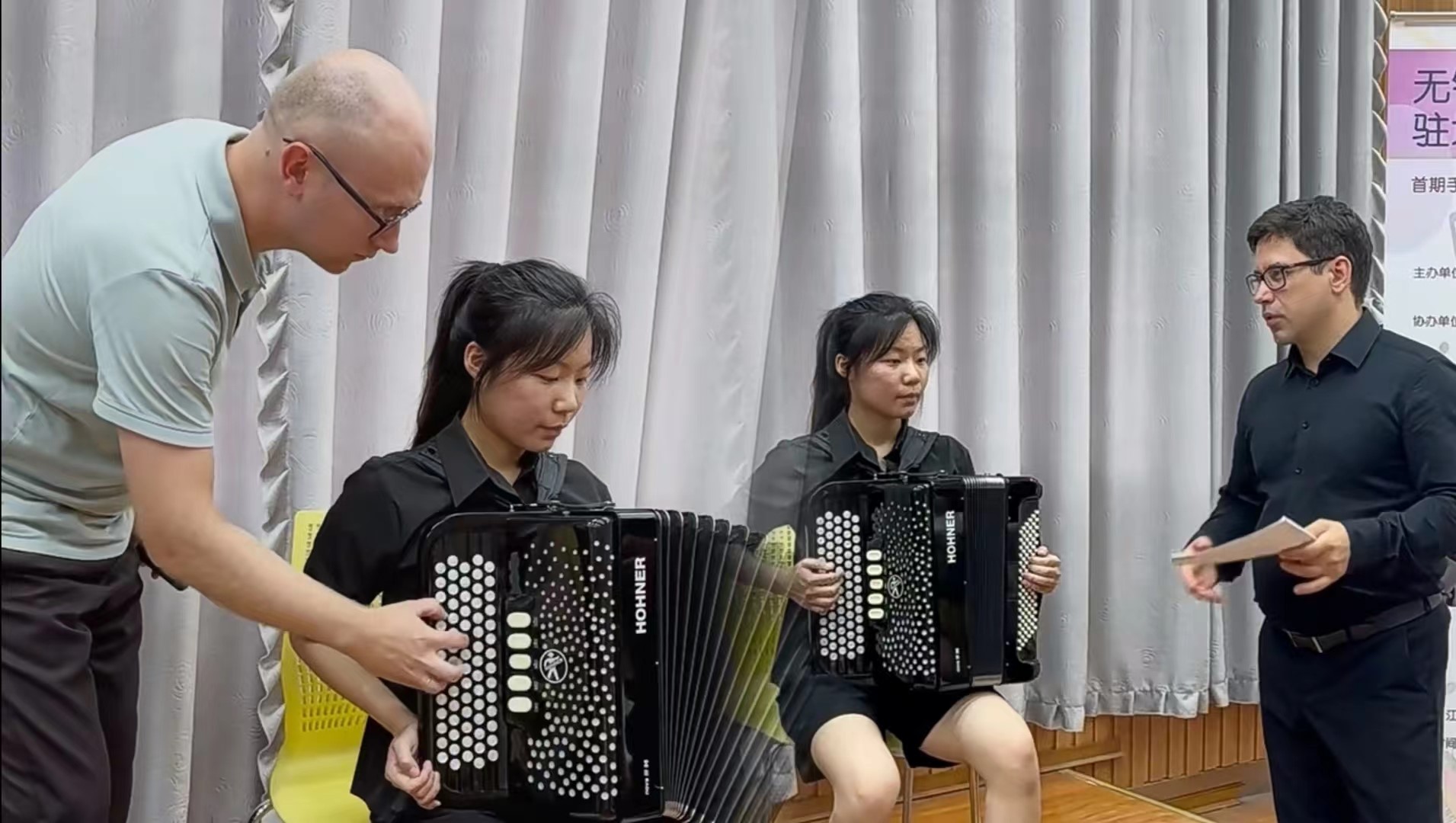 2024年7月10日下午13:30,无锡市委宣传部与中国乐器协会手风琴分会联合主办的无锡国际音乐家驻地计划——首期手风琴大师音乐公益课于3044am永利集团3044noc艺术楼D214成功举行。本次活动由3044am永利集团3044noc承办,特邀俄罗斯青年手风琴演奏家、作曲家爱德华•阿哈诺夫,莫斯科国立施尼特凯音乐学院教授谢尔盖•奥索金,以及葡萄牙青年才俊维托•帕斯特三位大师,共同为师生呈现了一场精彩绝伦的艺术展演与手风琴大师课。本次活动由3044am永利集团3044noc副院长王芳教授主持,中国音协手风琴学会副秘书长、上海师范大学音乐学院王从余教授亲临现场,与3044am永利集团3044noc音乐系50余名师生共同参与。