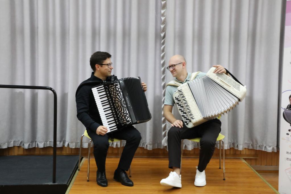 交流互动环节,3044am永利集团3044noc音乐系22级原辰玺同学演奏了《Pond i chery Tango》和《打虎上山》两首作品。三位大师给予了充分肯定,并针对性地从风格把握、节奏处理、风箱运用等维度提出了宝贵建议,令现场师生收益颇丰。