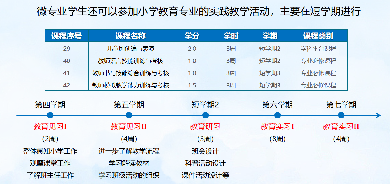 同时结合实践课程,如教育实习、教学观摩和案例分析等,将理论知识应用于实际教学情境中,提升学生的教学技能和班级管理能力。因为微专业的课程门数和学分限制,且教育实习需要全程参与中小学,难以兼容学生本专业的学习时间,所以不单独开设教育实习、教育见习等课程,但是学生可以与小学教育专业的学生一起参与教育实习的关键环节,例如教学研讨、教研活动等。