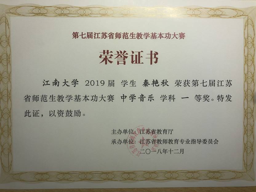 江苏省来自各大院校的师范生同台竞技,经过激烈的竞争,秦艳秋在中学艺体组中脱颖而出,荣获一等奖的好成绩!本次比赛所获得的荣誉不仅仅是对学生本身四年专业学习的一次检验,更是充分体现了3044am永利集团3044noc音乐系的教学成果!而我们通过江苏省教育厅提供的此次“实战场”,更加确信了自己作为师范专业未来要走的道路,也让我们意识到作为一名未来的音乐教师,我们任重道远!