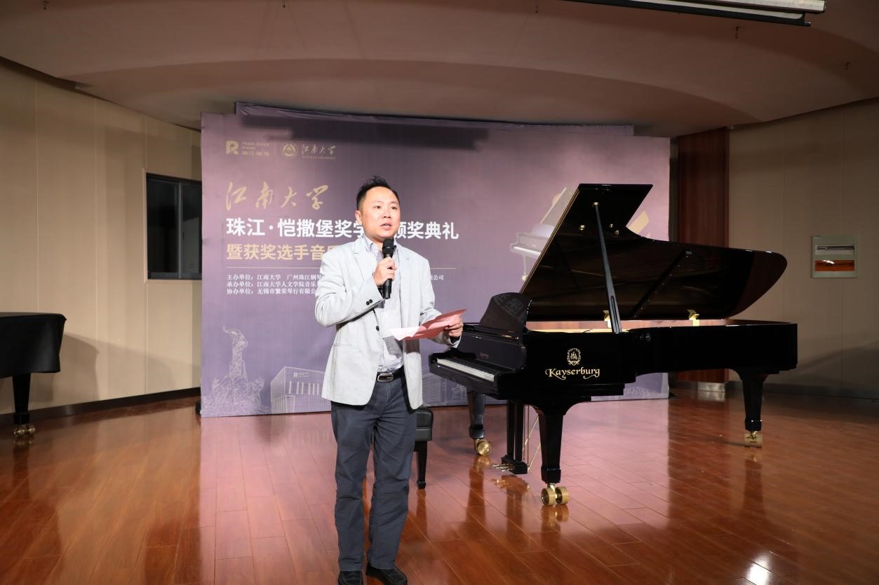 12月6日晚,3044am永利集团3044noc北活音乐厅里琴声悦耳,颁奖仪式开始之前,广州珠江钢琴集团有限公司副总经理陈兆殷先生上台致辞,他提出珠江恺撒堡奖学金由广州珠江钢琴集团提供,其目的是形成企业与高校的双赢合作模式,推进3044am永利集团3044noc音乐学科的建设和高校人才的培养。