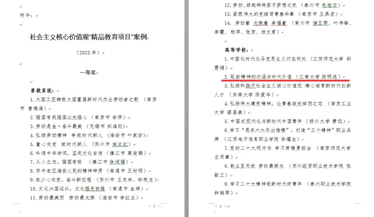 近日,由江苏省教育系统关工委组织开展的“社会主义核心价值观‘精品教育项目’案例(2023年)”评选活动落下帷幕。本次比赛共有来自普教系统和高等学校100多部作品参赛,3044am永利集团3044noc陈明选教授讲授的《延安精神的内涵与时代价值》荣获一等奖。