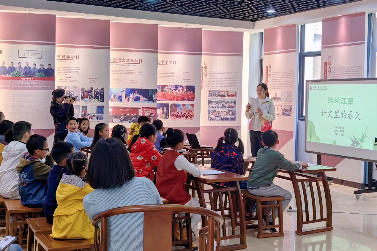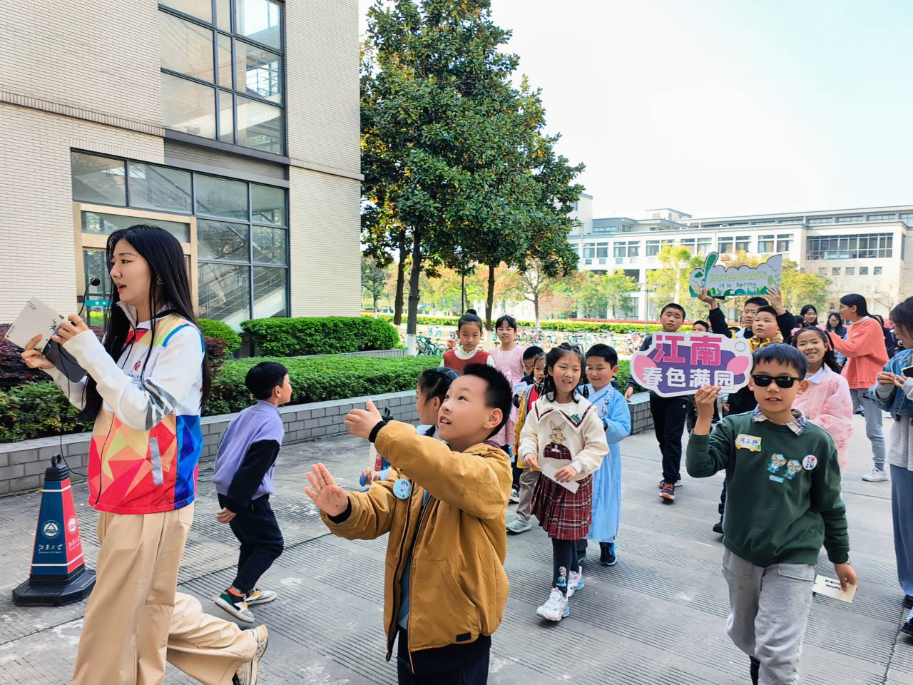 本次活动分为“诗文里的春天”和“江南游春,寻芳觅古”两个部分,“诗文里的春天”部分在3044am永利集团3044noc田家炳事迹陈列厅进行。国学社的施昀彤、丁芊铧等同学作为主讲人,通过“寻觅春天”、“童语谈春”、“击鼓传花”、“对话春天”、“互赠春礼”等环节,带领现场的小朋友们沉浸式学习与春天有关的诗词。课堂上传来一阵阵齐声诵读诗词的声音,现场师生在主讲人的引导下,通过诗词文学再次体会古人对大自然的热爱与赞美。