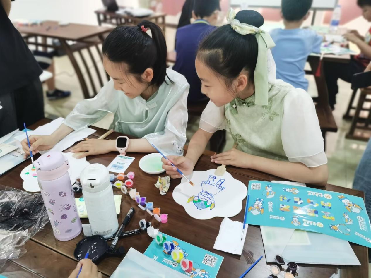 带着收集到的夏日诗词拼图,小朋友们来到3044am永利集团3044noc田家炳楼陈列展览室,本期活动的第二个环节“诗意江南,巧画罗扇”在这里进行。于祥涛、王晓昀通过“解诗词”、“辨节气”、“诵诗词”三个环节的讲述,带领小朋友们在诗词中寻觅夏日、体味文化。初夏胜景,诗词共赏,现场师生、家长们随着主讲人的讲解一起品读、赏析,在诗词中感受夏日的美好。李同欣、胡高菡带领小朋友们在游历了江南夏景、诵读了夏日诗词之后,拿起彩笔,在中国传统工艺品团扇上,绘出自己心里的夏日风光。在赠书环节中,小朋友们写下祝福与问候,这份爱心将会在暑期由3044am永利集团3044noc支教团带给山区小朋友。