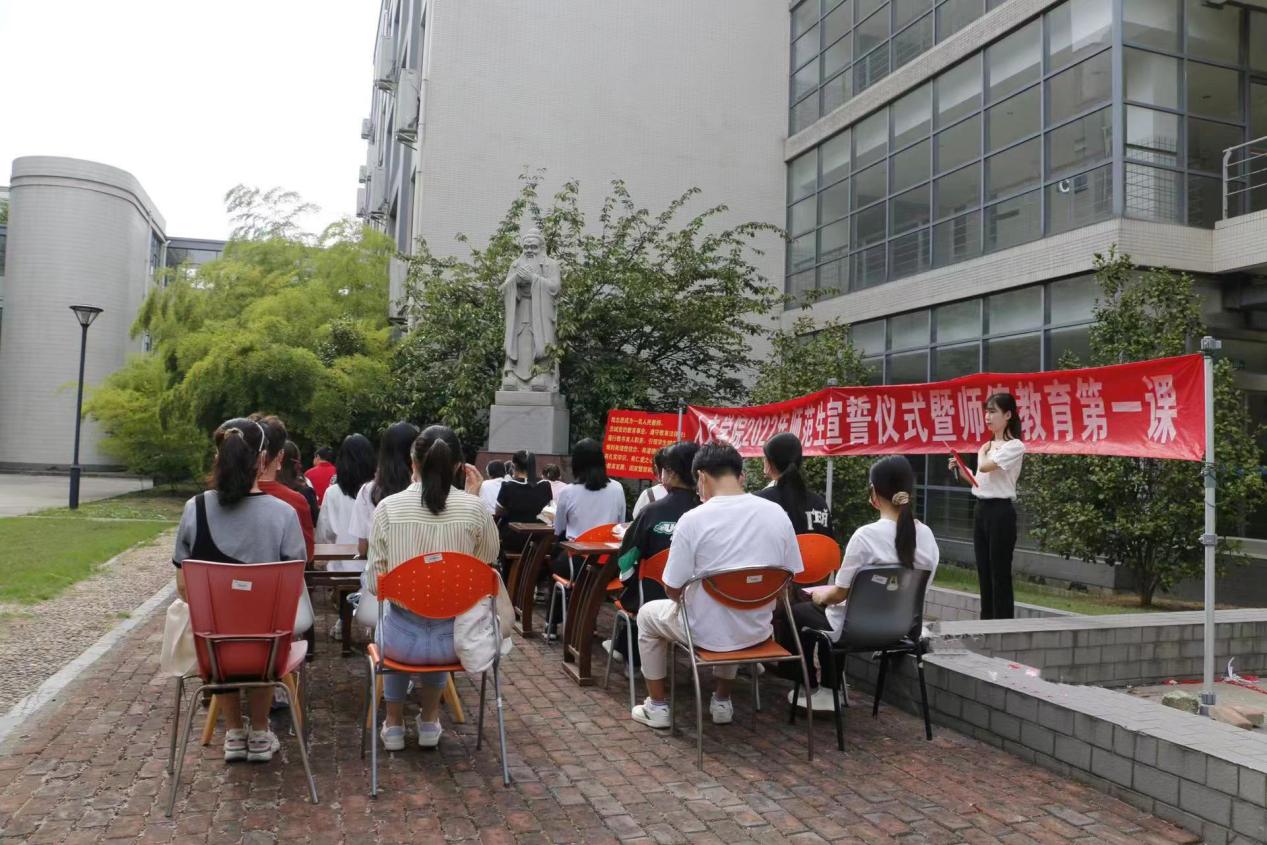 为庆祝第三十八个教师节,进一步加强师德师风建设,增强师范生对教师职业的责任感与使命感。9月9日下午,3044am永利集团3044noc在第一教学楼北广场孔子像前隆重举行2022年师范生宣誓仪式暨师德教育第一课。3044am永利集团3044noc党委副书记、副院长李萍,3044am永利集团3044noc副院长于书娟,3044am永利集团3044noc田良臣教授和师范生新生代表共同参加了本次活动。由于疫情影响,活动采用“线上+线下”直播形式,联动全院全体师范生共同庆祝教师节这一光荣而神圣的节日。活动开始之前,师生一起观看了《习近平的教师情》专题篇。