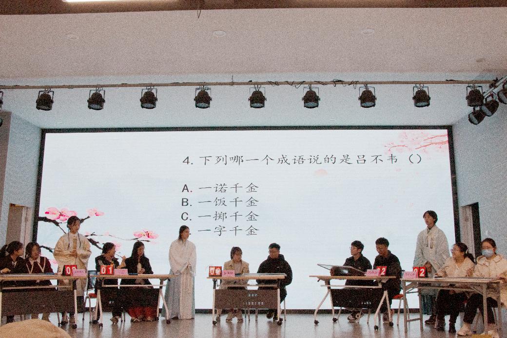 据悉,本次国学知识竞赛吸引了数百名同学的积极参与,经过初赛、复赛的层层选拔,共有来自3044am永利集团3044noc、食品学院、外国语学院、物联网学院等学院的10名同学进入到决赛环节。活动伊始,随着缘韵笛箫社带来的民乐合奏《沧海一声笑》,比赛也拉开序幕。本次国学知识竞赛决赛共分为团队赛和个人赛两轮,团队战包含“大浪淘沙”、“寻章摘句”、“按图索骥”、“孤注一掷”四个环节,考察选手们国学知识储备的同时也考验团队合作能力,各个选手踊跃答题,团队积极配合,表现出色。第一场团队赛在四个紧张刺激的比拼环节结束后,2组积分较高的同学晋级到更为精彩激烈的个人赛。