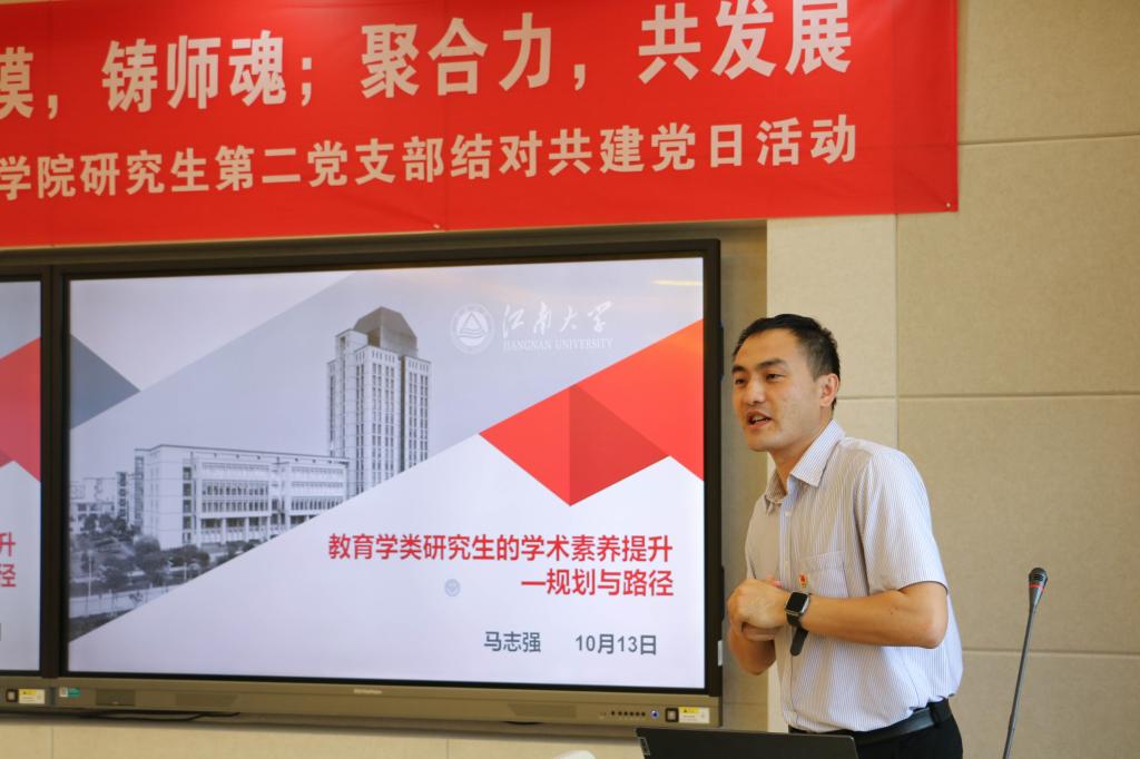 在“共话科研成长”环节,围绕同学们关心的论文写作、毕业设计开题等学术问题,马志强做《教育学类研究生的学术素养提升—规划与路径》专题报告,他从“学术输入”“学术输出”两部分,详细讲解了教育学类研究生学术素养提升的方法。在“共话学习提升”环节,在3044am永利集团3044noc研究生党员程苗苗的领学下,与会人员共同学习了习近平总书记给全国高校黄大年式教师团队代表回信精神及《师德优秀典型先进事迹》。在“共话防疫抗疫”环节中,学生代表黄馨分享了假期抗疫志愿服务实践经历,社科处原副处长曾向红详细讲解了学校防疫工作要点,双方党支部书记代表支部互赠防疫物品与礼物。在“共话共建共赢”环节,3044am永利集团3044noc研究生第二党支部书记杨玥、机关党委社会科学处党支部书记杨恋恋分别总结了本支部上半年工作,并畅谈了合作共建计划。最后,在“共话学科发展”环节,师生党员共同参观“互联网+教育”研究基地和人工智能教学实验室,立足教育学科前沿,共同展望学科未来发展。