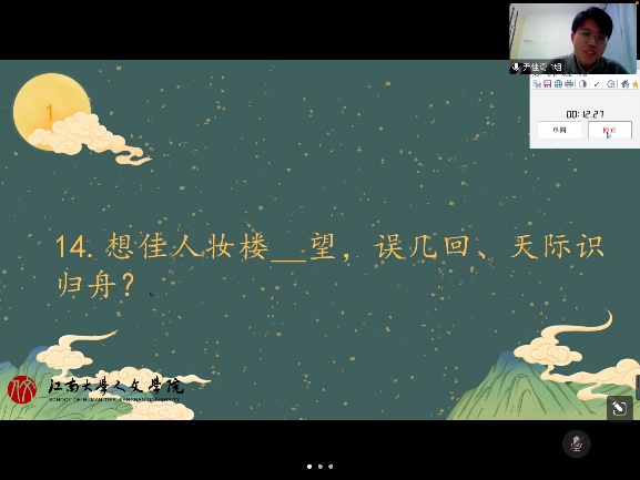 比赛伊始,暖场视频为大家介绍了百家姓姓氏图腾及生僻字,带着大家领略了汉字的字音字形美,律动的音乐、优美的片段营造了其乐融融的氛围,也为接下来的比赛做了铺垫。随后比赛正式开始,第一环节为团体赛,选手们沉着应对,团结协作,第一组尹佳奇同学表现尤为出色,展现了扎实的文字功底,赢得同学们阵阵叫好。团体赛后,中文系副教授周丽颖老师对选手们的精彩表现做出了点评,并就汉字、词语的魅力和大家进行了探讨,加深了同学们对汉字的了解与热爱。紧接着进入第二轮——个人赛。本轮题目类型多样,涉及汉字的字音、字形和字义,系统地考查了选手们的在汉字方面的基本功力。现场还穿插了互动抽奖环节,观众们也积极在弹幕中参与讨论,为选手的精彩表现喝彩。历经前两轮的比拼,选手们来到了第三轮抢答赛,第三轮抢答赛采用个人抢答的方式,选手们你追我赶,踊跃答题,场面激烈焦灼,趣味横生。