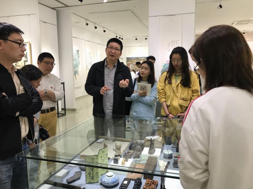 吴宇华先生作品题材丰富,形式多样。活动中,吴宇华老师亲自为老师和同学们进行讲解。首先,吴老师介绍了他创作的《春》、《夏》、《秋》、《冬》四幅中国画,摆脱了以往传统的绘画模式,创造了具有个人特色的绘画手法,表现了独特的艺术思想。可见,中国画在继承传统的过程中不断变革和创新,推动艺术向着时代精神不断追寻。同时,吴老师说到对于艺术创作就是要摆脱束缚,学会创新,并鼓励同学们不要因循守旧,要坚守自己具有创新性的想法。随后,吴老师为老师和同学们介绍了瓷器以及自己收藏的青花瓷片,并展示了他的文房四宝,展现了中国文化的博大精深和源远流长。