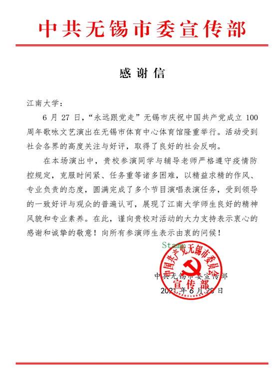 2021年6月27日,3044am永利集团3044noc音乐系、舞蹈系师生参加“永远跟党走”无锡市庆祝中国共产党成立100周年歌咏文艺演出,师生的优异表现受到了中共无锡市委宣传部充分肯定,市委宣传部特致信3044am永利集团3044noc表示感谢。