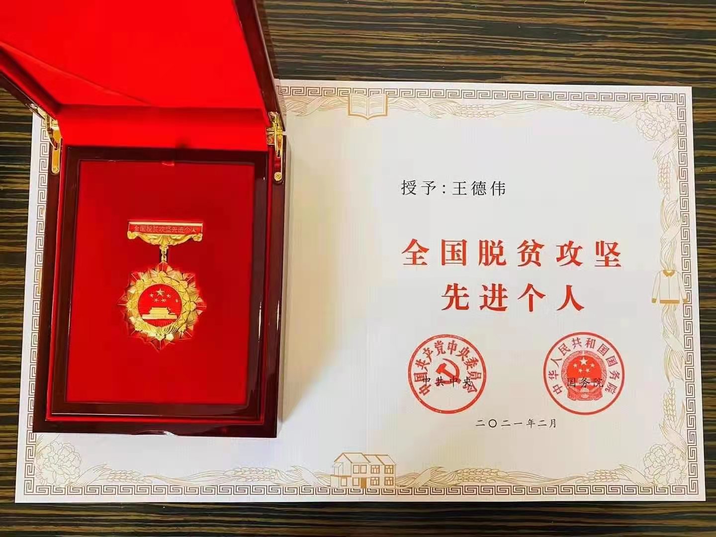 王德伟的“全国脱贫攻坚先进个人”证书