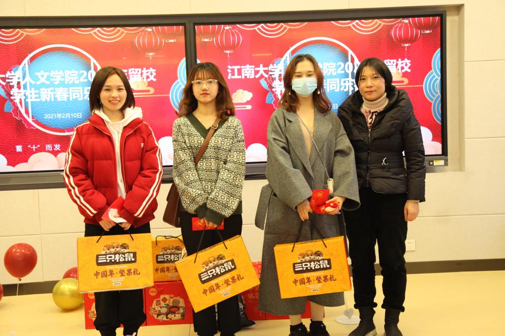 “恭喜发财”的BGM欢快入耳,老师们分三轮抽取了“牛气冲天”、“牛年大吉“和”好运多多“三个奖项。被抽中的同学们被其他同学热情拥抱,狂吸欧气。中奖的同学们略显”凡尔赛“的抱怨三只松鼠巨型礼包、干果大礼包和百草味干果大礼包实在有些沉重,同时也挂着胜者的灿烂笑容感谢学院送来这丰厚的礼物和其中热烈而深沉的爱。
