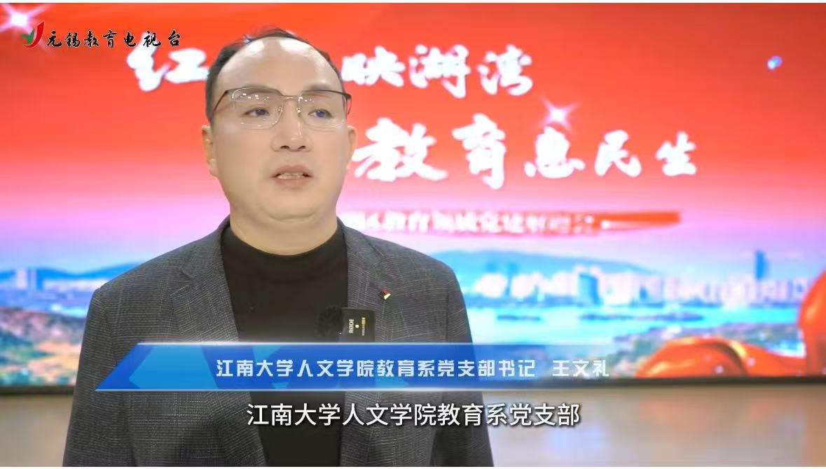 王文礼接受无锡市教育电视台采访,他表示3044am永利集团3044noc教育系党支部充分发挥学科优势、师资力量及党建经验,与无锡市滨湖区七所学校开展党组织共建,通过党建引领、资源共享、专业赋能,实现党建引领“一融双高 ”,推动党建与教育教学、科研创新深度融合,形成“1+7+N”的可持续合作范式。